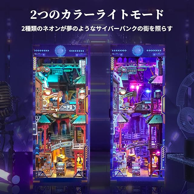 Tonecheer ブックヌック キット 立体パズル DIY ミニチュア ドールハウス 3D パズル サイバーパンク 木製 ブックエンド ブックノック 本棚装飾 手作りキット 初心者 大人向け 誕生日 プレゼント (サイバーシティ)