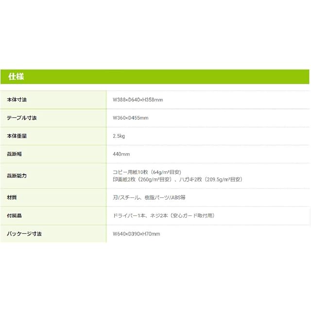 裁断能力:コピー用紙10枚(64g/m²目安)、印画紙2枚(260g/m²目安)、ハガキ2枚(209.5g/m²目安)