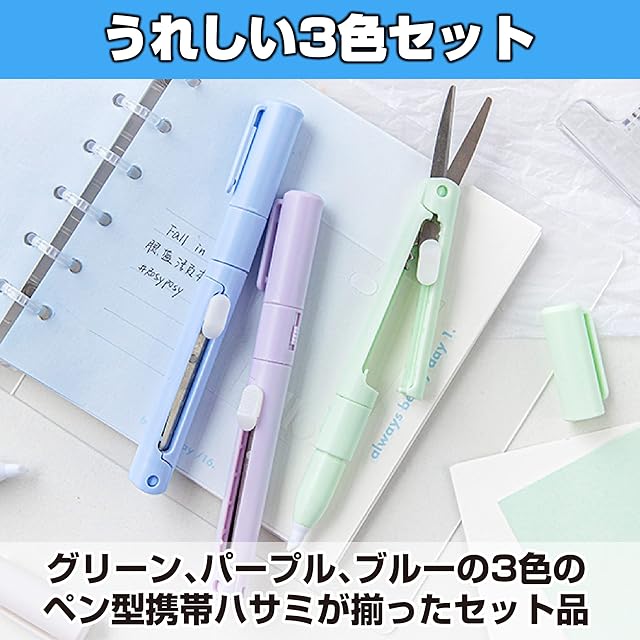 うれしい3色セット:グリーン、パープル、ブルーの3色のペン型携帯ハサミが揃ったセット品ですので、1つをペンケースに入れて携帯し、1つを胸ポケットに入れて携帯したりすることもできます。