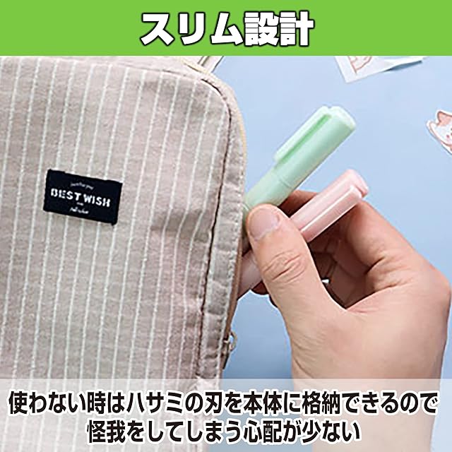 使いたい時にすぐに取り出せる:ペン型の携帯ハサミで、クリップを胸ポケットなどに挟んで携帯できるので、使いたい時にすぐに取り出しやすいです。スリム設計なので、ペンケースなどに入れて持ち運ぶこともできます。