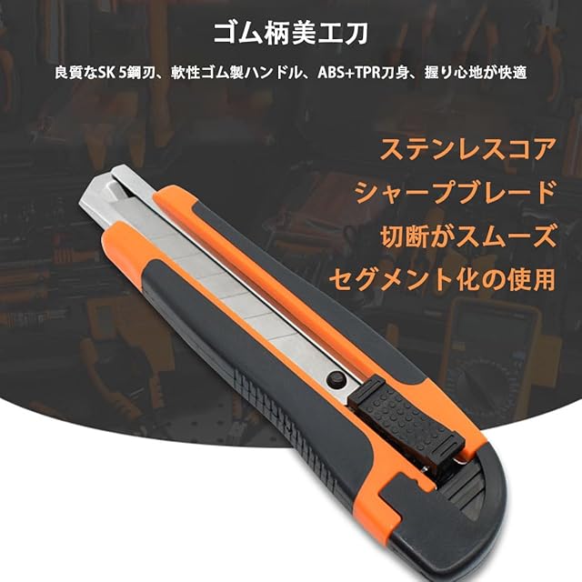 【製品の内容】大型カッター 美工刀 ゴム被覆 開梱神器 厚刃 多機能用途 耐久性 すべりどめハンドル ロック設計,製品サイズ15.60*4.30*1.0 cm。<br> 【滑り止め設計】この美工刀はゴム材質の滑り止めテクスチャ設計を採用し、どの材質の切断任務に直面しても、刀身の安定した滑り止めを確保することができると同時に、その独特なグリップ設計は、人体工学の原理に適合し、連続作業中でも安定して楽なグリップ姿勢を維持することができる。<br> 【鋭利な刃】美工刀片の鋭利な表面はフッ素処理を経て、刃の耐食性と耐摩耗性は大幅に強化され、鋭利無比で、薄紙から皮革、さらには軽量プラスチックなど多種の材質の精密な切断作業を容易に制御でき、驚くべき軽さの切削効果を実現した。<br> 【コンパクトで持ちやすい】コンパクトで洗練された外観のこの美工刀は、持ち歩くリュックサックのサイドバッグに入れても、作業服のポケットに簡単に滑り込むこともストレスなく、カットが必要な場面でも迅速に取り付けることができ、いつでもどこでも効率的で便利です。<br> 【品質】 ご利用中に問題があれば、お気軽に弊社にメールでご連絡ください。デルのサービスチームは24時間、お客様に満足のいくソリューションを提供します。(注文番号は書のかわりとなります)。