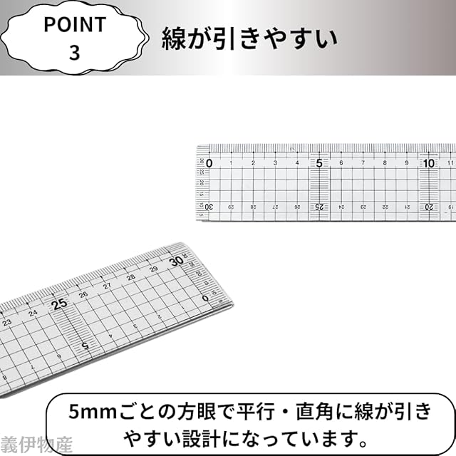 【ステンレスガード付き】カッティング作業に便利なステンレスガード付き30cmの定規です。 【カッティングしやすい】刃滑りがよくカッティングしやすくなっています。 【線が引きやすい】5mmごとの方眼で平行・直角に線が引きやすい設計になっています。