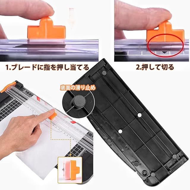 ✅【スライダー式ペーパーカッター】ペーパーカッターA4サイズまで簡単にカットできます。A4サイズまでのコピー用紙がカットでき、最大10~12枚までまとめてカットできるので便利です。スライダーは刃が小さく、下げるだけで簡単にカットできます。また、ペーパーカッターには滑り止めのゴムキャップが付いています。底面には滑り止めが付いているので、裁断時に滑りません。