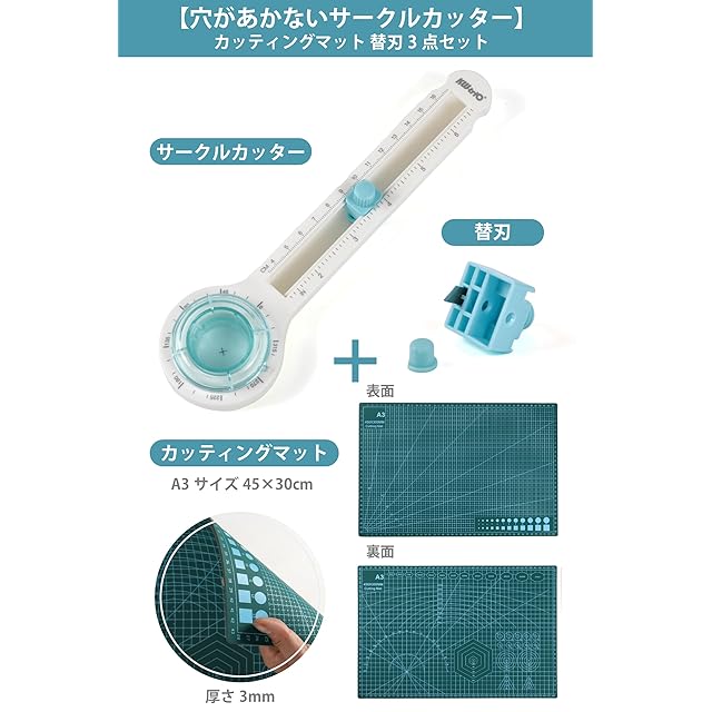 【穴があかない】 サークルカッター 半径4cm~16cm A3カッティングマット 替刃 3点セット (グリーン)