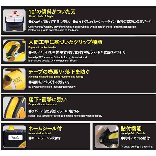 【商品仕様】サイズ:、幅6×奥行17×高さ7.5cm、素材:本体:ABS、TPE、刃:特殊刃物鋼、韓国製※幅45~50mmのOPPテープ対応 ※仕様可能なテープ直径:最大約120mm、紙芯約75mm ※ネームシール2枚付き
