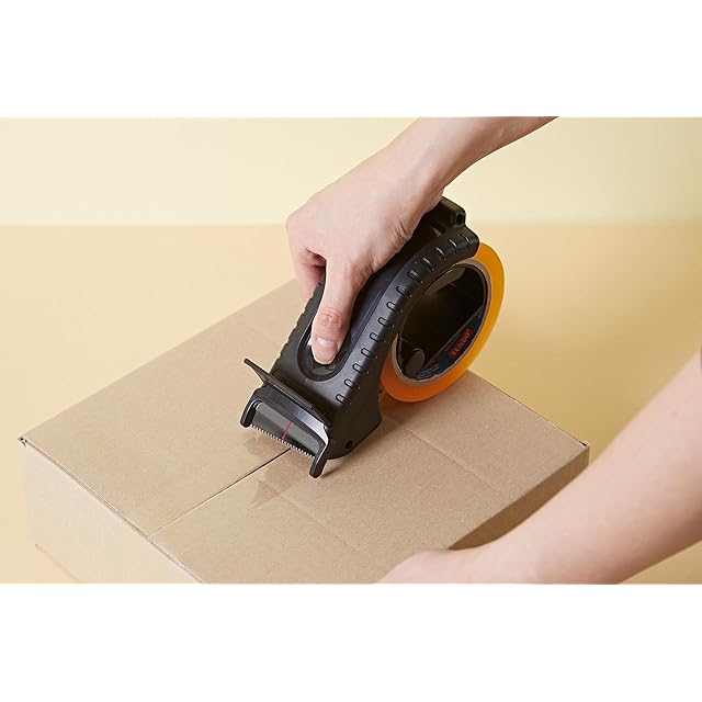 【使い方】①テープホルダーを下ろします。②テープを装着後、ホルダーを戻します。③ローラーストッパーの間にテープを通します。④グリップを左右どちらかに合わせ本体を握ります。⑤親指を凹みに当てながら使用します。⑥段ボール使用の際は本体上部のプラ板を押し付け下に降ろします。その際に親指に力を加えるのがポイントです。※段ボール以外の梱包では親指をクイっと押すと切れます。
