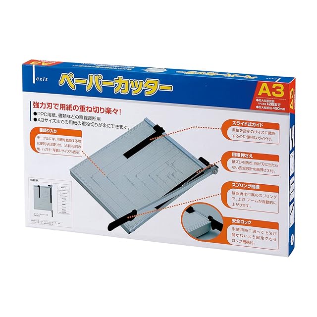 【機能】未使用時に上刃が開かないよう固定できる「安全ロック」、スライド式ガイド、目盛線、安全設計の紙押さえ付き