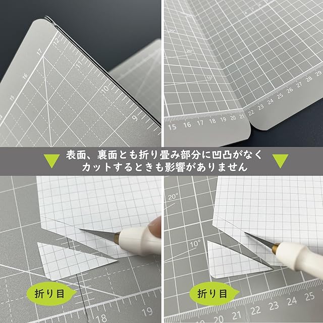 ・【実用新案 →第M594598号】両面仕様。特許を取得した特別なデザインにより、表面に折り目部分の凹凸がなく、裏面も切り込み部分が密接していて隙間がないためカッターを使う時もスムーズに切ることができます。