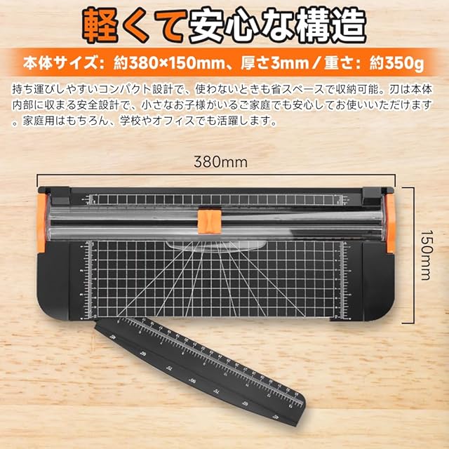 【軽くて安心な構造】本体サイズ:約380×150mm、厚さ3mm/重さ:約350g。持ち運びしやすいコンパクト設計で、使わないときも省スペースで収納可能。刃は本体内部に収まる安全設計で、小さなお子様がいるご家庭でも安心してお使いいただけます。家庭用はもちろん、学校やオフィスでも活躍します。