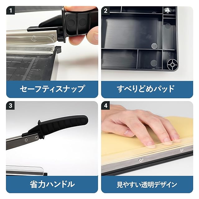 【安全な裁断デザイン】:透明フェンスと紙ロック機能が付いており、指を保護します。 ベースのロックフックが刃を固定し、偶発的なカットを防ぎます。 安心して裁断をお楽しみください!