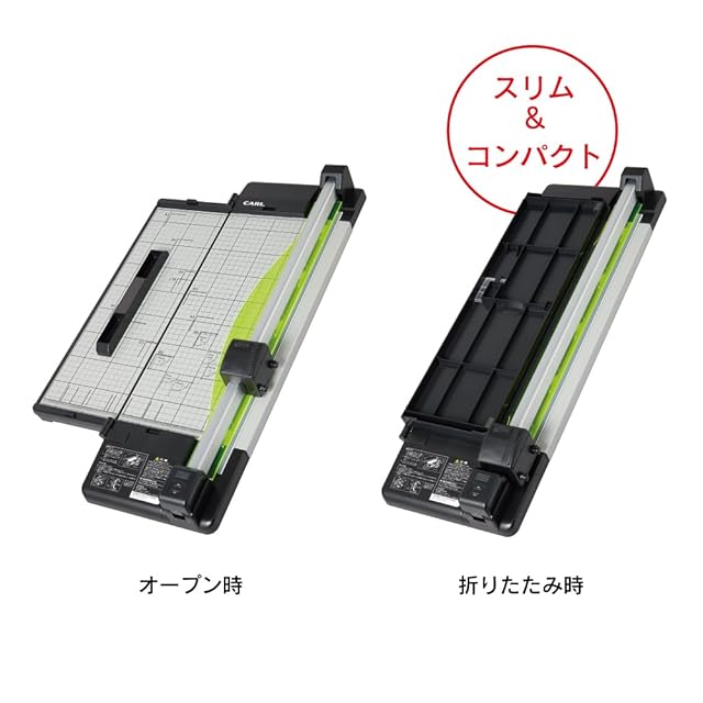 折り畳み式のコンパクトな裁断機。裁断位置が光ってわかり正確に裁断できます。刃は押し切りタイプではなく回転刃なので、安全設計です。