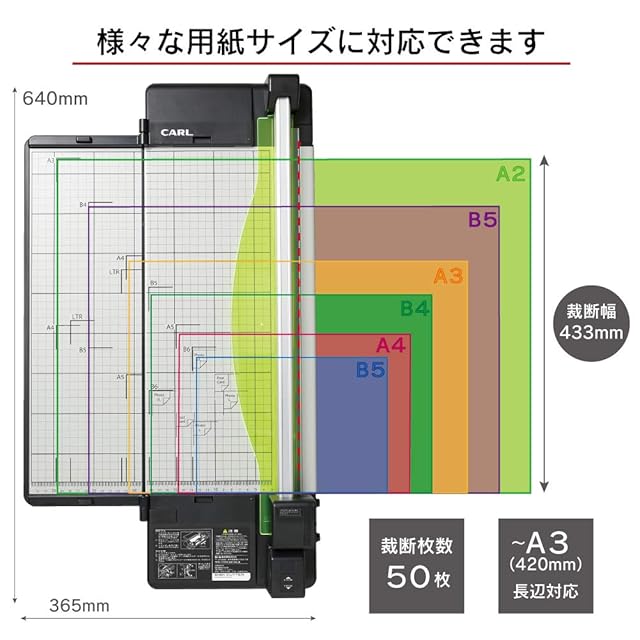 【裁断枚数】丸刃約50枚(コピー用紙64g㎡/使用時) 2.5往復目安 【裁断幅】433mm(A3長辺程度)