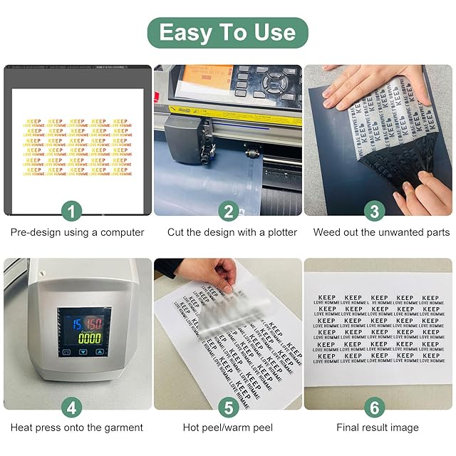 ヒート転写ビニールはPVCポリ塩化ビニールとHTV素材で作られており、弾力があり柔らかく、洗濯機で洗えるため、子供服やアクセサリーの装飾に最適です。<br />転写ビニール素材は適切な厚さがあり、デザインに応じて簡単にカットでき、切りやすく、剥がしやすいです。<br />HTVビニールは、個人用Tシャツ、カップルTシャツ、パンツ、帽子、コート、バッグなどに適しており、クリスマス、誕生日、ハロウィン、記念日、誕生日ギフトやパーティーの個人用ギフトを作るのに最適です。<br />注意:綿、ポリエステル綿混紡生地に適しています。ドライクリーニングや漂白はしないでください。洗濯前に少なくとも24時間待ってください。<br /><b>使用方法:</b><br />ヒート転写フィルム/ビニールをエングレーバーに置き、圧力と速度を調整します。<br />コンピューターで印刷したい画像を選択し、ミラーを選択してから、エングレービングボタンをクリックします。<br />フィルムからエングレーブされたパターンを切り取り、不要な部分を剥がし、画像を使用できるようにします。<br />エングレーブされたパターンを服に置きます。150℃〜160℃の温度で5〜10秒間プリントするためにヒート転写機を使用し、透明な保護フィルムを一度剥がし、その後画像が服に転写されます。<br /><br />