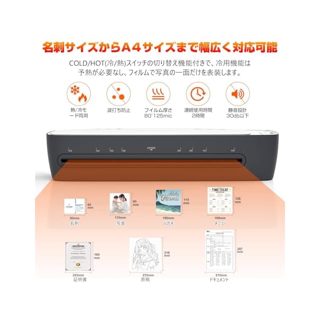 【静音設計&冷熱両用】いつでも楽にラミネートできます。使用時の騒音は30db以下で、仕事の邪魔にならず寝ている子ども起こすような音はでません。COLDとHOT(冷/熱)スイッチの切り替え機能付きで、写真や感熱纸など今までラミネートできなかったものも大丈夫です。COLDとHOT(冷/熱)状況に合わせて使えるます。学校や職場、ご自宅、店などの場合で大活躍です。家族写真を長く保存したり、及び、貴重な資料、メニュー、名刺、従業員証などの汚れや劣化を防ぎ、長く使うことができます。注意:付属したフィルムはすべてHotの専用フィルムです、Coldのフィルムは別売り必要です。