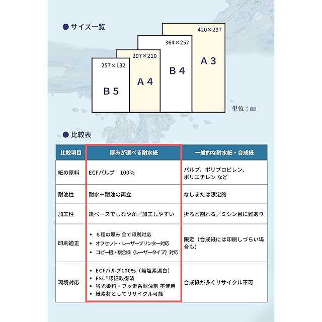 厚みが選べる耐水紙 B5サイズ 最薄口 20枚 国内製造品 耐水性 撥水性 耐油性あり 紙厚約0.07〜0.4mm(最薄口〜超厚口)レーザープリンタ対応 色鮮やかな印刷を実現 チラシ POP ラベル 商品タグ パッケージに最適 A4 A3 B4 B5サイズにもバリエーション対応 田村商店裁断品