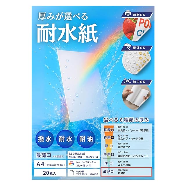 厚みが選べる耐水紙 A4サイズ 最薄口 20枚 国内製造品 耐水性 撥水性 耐油性あり 紙厚約0.07〜0.4mm(最薄口〜超厚口)レーザープリンタ対応 色鮮やかな印刷を実現 チラシ POP ラベル 商品タグ パッケージに最適 A4 A3 B4 B5サイズにもバリエーション対応 田村商店裁断品