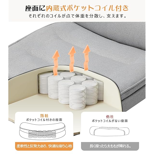 【広い座面&ポケットコイル内蔵】当社の椅子は他よりも20%〜30%幅広。内蔵式ポケットコイルは、お尻をしっかりと支え、長時間座ってもへたることがありません。背もたれと座面クッションは非再生ウレタンを採用します。まるでソファに座っているかのような快適さを提供します。