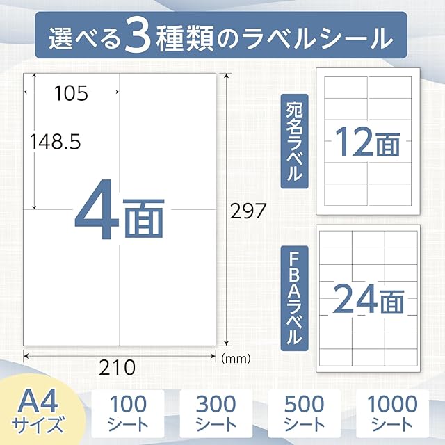 【仕様】:A4判(210mm×297mm); ラベルサイズ: 105×148.5mm(2列×2段) ;ラベル枚数:400枚 (4面×100シート);シート標準総厚み:0.15mm;材質:上質紙(マット紙)
