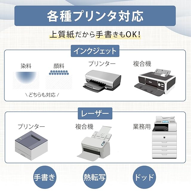 【対応機種】:弊社のラベルシールは、家庭用インクジェットプリンター、商用レーザープリンター、コピー機だけでなく、手書きにも使用できます。
