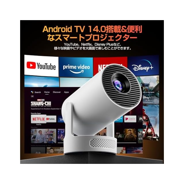 【Android TV 14.0 搭載・350インチ大画面・短距離投影・自宅の映画館!】:プロジェクター 家庭用にはAndroid TV14.0 が内蔵されており、Wi-Fiに接続すると、Prime Video、YouTube、Netflix などの8,000 以上のアプリから 500,000 本以上の映画やテレビ エピソードを楽しめます。要件に応じて Google Playストアやアプリストア から豊富なアプリをダウンロードできて、TVスティックを別途購入や複雑な設定は一切不要です。0.5M~3Mまで短距離投影でき、小さい部屋でも十分に使え、手軽に30インチから350インチまでの大画面で楽しめます。ホームプロジェクター は270°自由に回転できる一体型デザインを採用しており、三脚を使用せずに自由に投影角度を選択で、座ったり、寝転んだり、横向きになったりしながら、リラックスした映画鑑賞体験を実現できます。