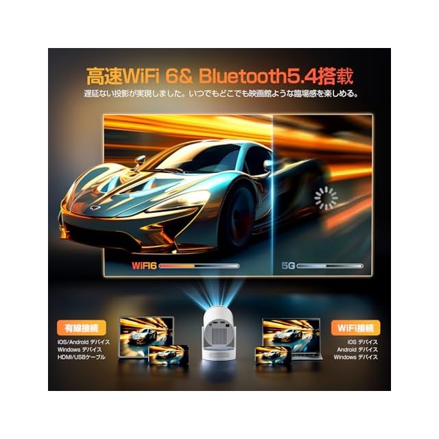 【高音質HiFi外部スピーカー・超高速Wi-Fi 6・Bluetooth5.4】:このぷろじえくたー 家庭用 小型は高品質 HiFi 外部スピーカーとBluetooth 5.4 が内蔵しており、自宅で迫力の3Dサウンドを楽しむことができ、臨場感あふれる映画館のような空間を演出します。高精度チップ技術を使用してある本小型プロジェクターは、2.4G+5Gの周波数帯を同時利用でき、安定した信号と高い伝送速度を備えた超高速 6G WiFi 接続テクノロジーも備えています。 iOS、Android、Windows デバイス (ミラーリング対応のスマートフォン、タブレット、コンピューターなど) を Wi-Fi 経由ですばやく接続し、非常にスムーズで遅延のないオンライン ゲーム、映画鑑賞、ビデオ体験を簡単に楽しめます。
