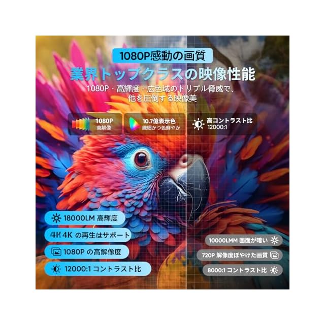 【18000ルーメン&4K対応! 目が覚めるような"超現実"画質!】WISHOLYの新次元プロジェクターは、18000ルーメンという高輝度で、昼間でもくっきり鮮明!12000:1の驚異的コントラストが作り出すのは、もう「映像」じゃない…「現実そのもの」の衝撃!「髪の毛一本一本、肌の質感、背景の微細な模様まで…」まるで画面から飛び出してきそうな超精細表現! 特に大画面で視聴すると、その臨場感は圧倒的で、まるで目の前に情景が広がっているかのような没入感が得られます。専用のスクリーンがなくても自宅の壁に投影するだけで、きれいな映像を楽しめます。また、拡散反射の原理でテレビの直射光より小型プロジェクターの拡散光源がもっと柔らかくて、視覚的に楽しみながら目をしっかり守ることができます。