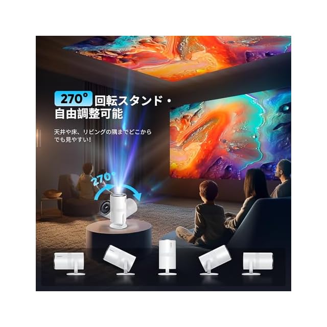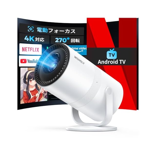 商品名:WISHOLY プロジェクター 小型【2025年超小型・Android TV搭載・電動フォーカス・270°回転】ぷろじぇくたー 家庭用 18000LM 1080P WiFi 6 プロジェクター 天井 Wi-Fi 自動台形補正 Bluetooth5.4 内蔵HiFiスピーカー 50%ズーム機能 静音設計 スマホ/PC/Switch/DVD等接続可能