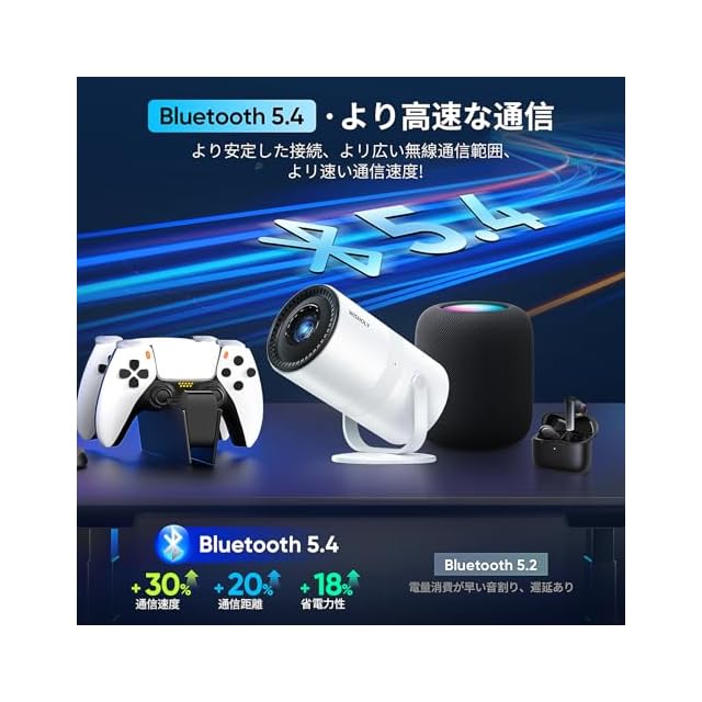 【Wi-Fi 6&Bluetooth 5.4で次世代接続】当プロジェクターは最新Wi-Fi 6規格を採用し、超高速通信と「遅延ゼロ」に近いレスポンスを実現。 iOS、Android、Windows デバイス (ミラーリング対応のスマートフォン、タブレット、コンピューターなど) を Wi-Fi 経由ですばやく接続し、非常にスムーズで遅延のないオンライン ゲーム、映画鑑賞、ビデオ体験を簡単に楽しめます。さらに最新のBluetooth 5.4を搭載し、伝送速度と接続安定性を大幅に向上。ワイヤレスイヤホンやスピーカーとの接続がよりスムーズになり、映画鑑賞時には映像と音声の完璧なシンクロを実現。ゲームプレイ時にもアクションと効果音の微妙なタイミングのずれを解消し、没入感のあるエンターテインメント体験をお約束します。
