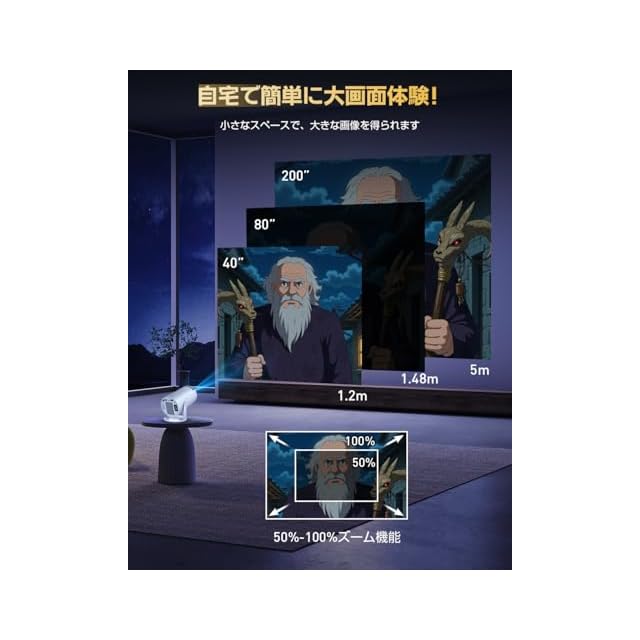 商品名:プロジェクター 家庭用【2025年6月新機種&最新進化Android TV搭載!20000LM&270°回転&4K対応】Wi-Fi6瞬間接続 1080P 50%ズーム スマホ プロジェクター 小型 天井投影 垂直台形補正 Bluetooth HiFiスピーカー ホームプロジェクター 高輝度 短距離投影 軽量 スマホ/パソコン/PS機/DVD接続可 日本語説明書