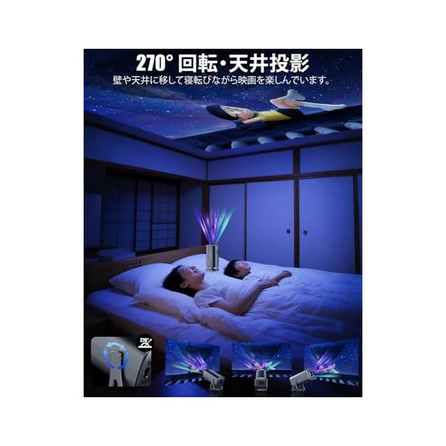 【270°回転・自動台形補正・操作が簡単】一体型スタンドのプロジェクターは三脚が不要、270°回転に対応しており、スタンドを回転させるだけで投写角度を自由に調整でき、壁や天井など、様々な場所に簡単に投写できます。座っていても、横になっていても、リクライニングしていても、リラックスして快適な視聴体験を提供します。そして、自動台形補正機能により、面倒な手動調整は不要で、プロジェクターを振るだけで完璧な投影画像を得ることができます。また、4 点の垂直および水平補正により、傾斜した投影の場合でもリモコンを使用してニーズに合わせて手動で簡単に調整できます。