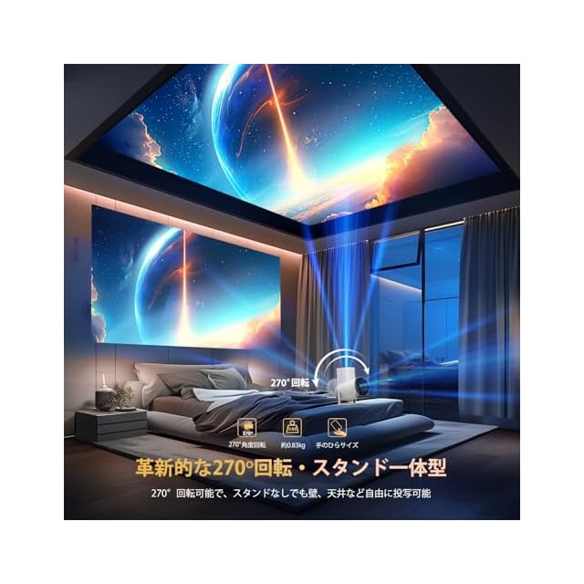 ✅【革新的な回転可能・スタンド一体型・自動台形補正機能】【限定期間キャンペーン】今ご注文いただくと、すぐプロジェクター専用のスクリーンがもらえる!お気軽に説明書の連絡先までご応募してください!従来のプロジェクターと異なり、YOWHICKプロジェクターは270度回転可能なスタンドを搭載しているため、スタンドを追加購入する必要はありません。投影角度を自由に調整し、ご自宅の壁や天井に投影することができます。また、自動台形補正機能を搭載しており、誤ってプロジェクターを動かしてしまっても、自動的に映像を補正します。(注:自動台形補正が正しく機能するには、プロジェクターが45度以内に収まっている必要があります。)卓上やベッドなどにそのまま置くができ、正面だけでなく天井などにも投影でき、寝転びながらでもコンテンツを楽しめます。設置場所に制限がなく、本当に自由な投影を実現します!