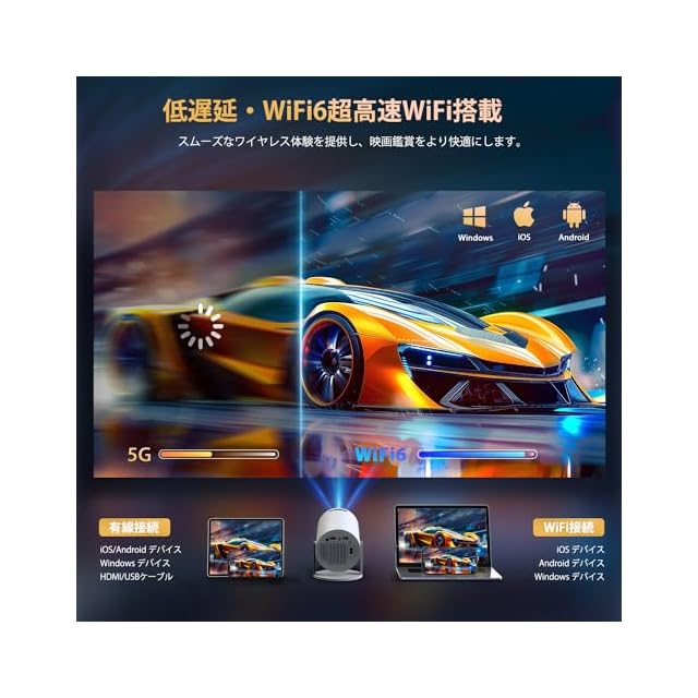 【超高速5G&2.4G・Wi-Fi 6・Bluetooth5.3対応】小型プロジェクターは、超高速5G&2.4Gと先進のWi-Fi6技術を搭載しており、遅延を最大60%削減されて、より高速で安定したインターネット接続を実現します。Wi-Fi経由でiOS、AndroidおよびWindowsデバイスを素早く接続でき、超スムーズで遅延のないオンラインゲーム、映画鑑賞、ビデオ学習体験を簡単に楽しむことができます。また、Bluetooth5.3も搭載し、ご愛用のスピーカーやワイヤレスイヤホンやから音声を流すことができ、迫力ある映像をこだわりの音響環境で映画館のような雰囲気を楽しむことができます。(ご注意:SONYのBluetoothスピーカーとの互換性はありません。)
