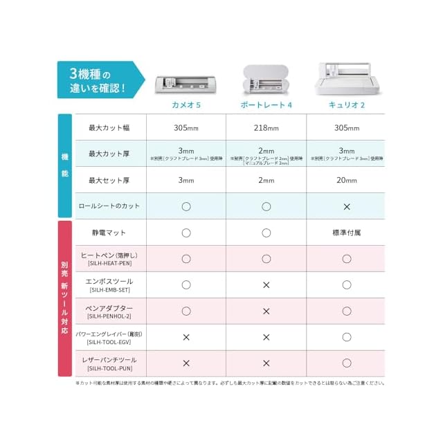 もっと正確に、幅広く、使いやすく。<br> <br> POINT1:驚異のカット精度<br> <br> ■音を気にすることなく、作業に没頭できる<br> CAMEO5 は新しいベルトドライブの採用により振動を抑え静音化を実現しました。<br> 静かになった CAMEO5 は使う場所も選びません。<br> <br> ■新しいラインアップ「静電マット」により、これまで以上に多様な素材に対応<br> オプション品である「静電マット」を使用することで、<br> 和紙やトレーシングペーパー等の薄い素材のカットが出来るようになりました。<br> 「静電マット」はスイッチひとつでしっかりと固定することができるため、<br> カット後に素材を取り外す際も紙の カール や 破れ を防ぐことができます。<br> <br> ■世界初の技術で複雑なデザインも高品質なカットを実現<br> カット時の用紙のズレを最小になるようカット順を最適化する機能です。<br> これにより複数枚の薄紙を重ねてカットすることや、細かいデザインなどで角めくれを防ぎ<br> 綺麗にカットすることができます。<br> <br> <br> POINT2:「切る」そして「」<br> <br> ■豊富なツール対応でカッティング体験を楽しめる。<br> 新ツールでもっと拡がる、あなたの可能性。<br> <br> ■ヒートペン<br> カード台紙や合皮素材に箔押しができるヒートペンで作品に箔押し加工を施すことができます。<br> ご自宅のデスクで箔押しができる時代がやってきました。<br> <br> ■エンボスツール<br> カード台紙に浮き出し模様をつけることができるエンボスツールは作品のクオリティを一気に高めることができるツールです。<br> エンボス、デボスそれぞれ施すことができます。<br> <br> ■ペンホルダー<br> 新しいペンホルダーはこれまでよりも太い直径のペンにも対応。<br> ペン先の角度を固定することもできるので美しいカリグラフィーを施せます。<br> <br> <br> POINT3:もっと使いやすく<br> <br> ■専用スマホアプリ「シルエットゴー」<br> 誰でも使いやすいモバイルアプリ「シルエットゴー」の機能が強化されました。<br> これまでのデータ出力機能に加えて、画像や写真からカットデータを作成できる「トレース機能」、<br> そして自由に文字を作成できる「テキスト機能」が追加されました。<br> <br> ■トンボ読み取り機能の向上<br> 新しいCAMEO は素材の表面に応じて読取センサーの感度を調整することができます。<br> これにより、メタリックやラメ、グリッターなどの光沢のある素材のトンボマークも読み取りが可能になります。<br> <br> ■新設計のピンチローラー<br> 新設計のピンチローラーにより、グリップ力の向上と固定位置の微調整が可能になりました。<br> 標準サイズよりわずかに大きい、または小さい素材にも対応できるなど、位置調整が簡単になりました。<br> <br> ■オートクロスカッター<br> ロールメディアカット後の手動の横切りカットが自動となるオートクロスカッターが追加されたため、<br> 切断後にメディアを再度ロードする必要がなくなり、使いやすくなりました。<br> <br> ■作業効率化に最適なリピートジョブ機能<br> マシンのボタンを押すだけで、直前のジョブと同じデザインを繰り返しカットができる<br> リピートジョブ機能が追加されました。<br> そのため、ソフトウェア上で再度操作をすることなく簡単にカットを行うことができます。