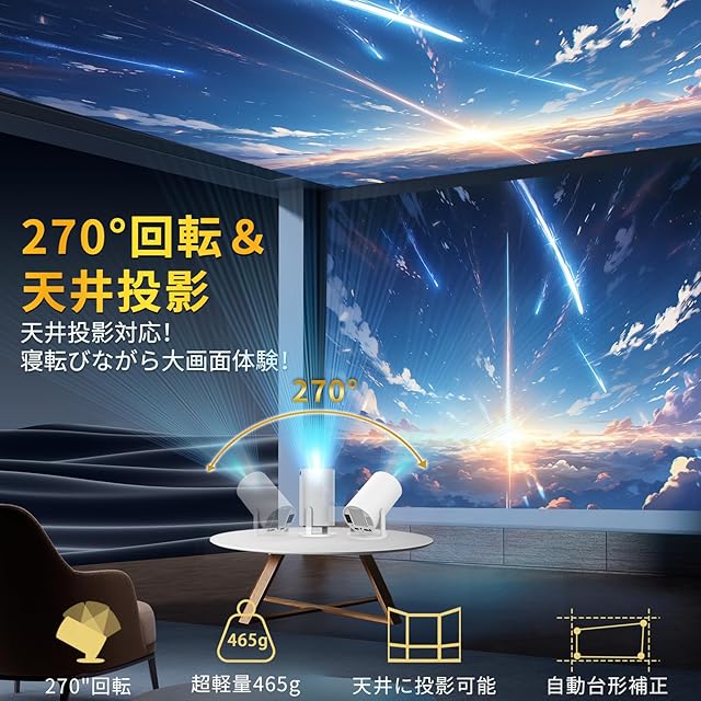 【270°回転・天井投影対応・自動台形補正】 270°回転するスタンド一体型で、三脚を使わずにスタンドを回転させて投影角度を選べます。また、プロジェクター 天井 は壁や天井に投影することもでき、座ったまま、寝転んだまま、横向きでもリラックスして視聴できます。さらに自動台形補正機能を搭載し、プロジェクターの角度を変えるだけで即座に補正します。それ以外、 天井 プロジェクター は手動台形補正機能も搭載しており、4面補正機能と連動し、リモコン操作で瞬時にスクリーンを長方形に補正し、あらゆる角度から最適な投写映像を実現します。