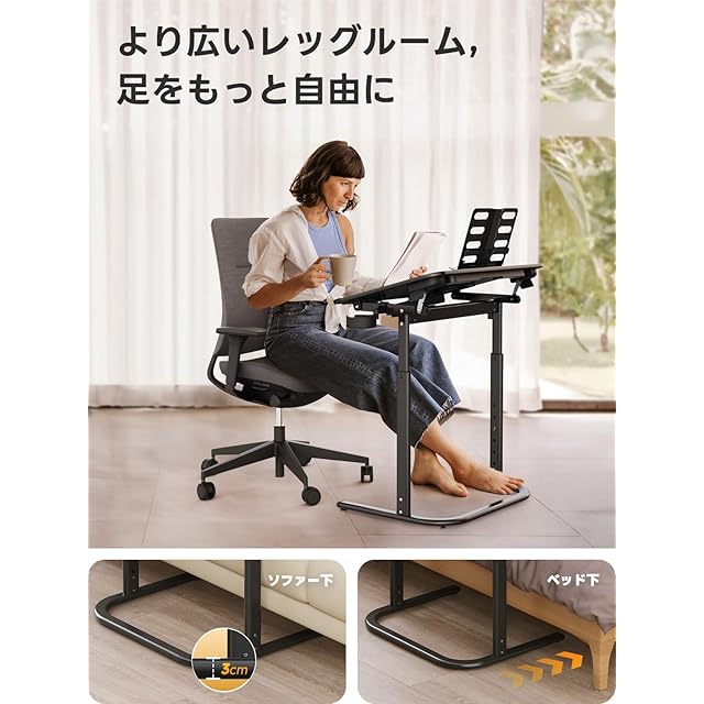 【優れた安定性】従来のサイドテーブルの問題点を改善して、本製品は天板の厚みとスチールフレームの厚みを増加することによって、安定性、強度及び耐久性が強化され、従来のサイドテーブルより頑丈になっています。コ字型のデザインにより、ソファやベッドの下のスペースに入れ、揺れることがなく快適にノートパソコンなどを使用できます。