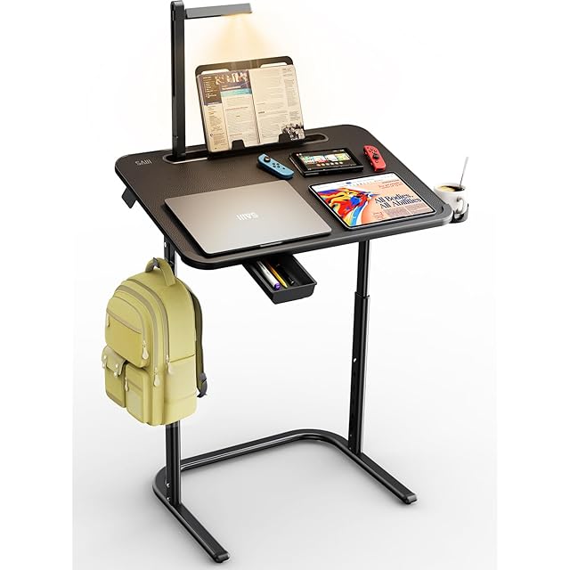 SAIJI サイドテーブル LEDライト付き ノート勉強机PCパソコンテーブル 「安定性強化版 一人暮らし 昇降式テーブル 3段階の明るさ調整可能 角度調節可能 PU 天板 書見台&ドロワーズ付き 天板65*45*3cm 5段階の高さ調節 高さ55cm-75cm ブラック