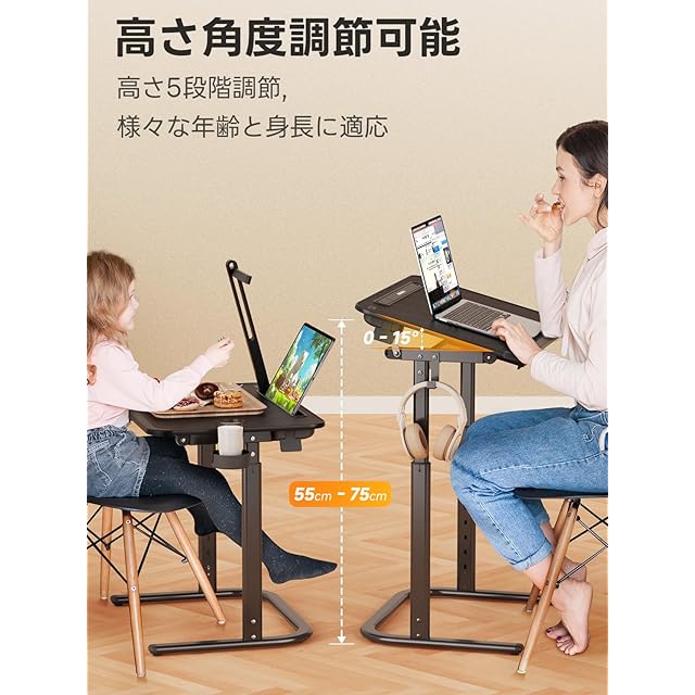 【高さと角度調整】SAIJIの昇降式テーブルは、52.5〜72.4㎝まで6段階の高さに簡単に調整することができます。テーブルの高さは大人から子供までよくフィットし、15°角度に調整可能、ノートパソコン利用者にとって視線調整でき、便利です。テーブルの天板は55x39㎝を測定して、それはラップトップ、マウス、食品トレイを置くのに十分なスペースを持っています。