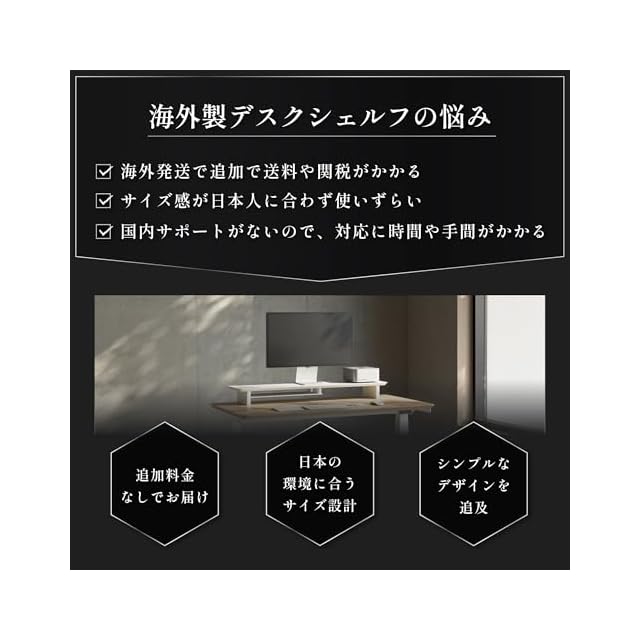 デスク上にモニター台を設置すると、作業中の目線を上げることができます。これにより自然と首や背筋を伸ばすことができるため、作業効率化を図ることができるという人間工学設計に基づいたデスクシェルフです。