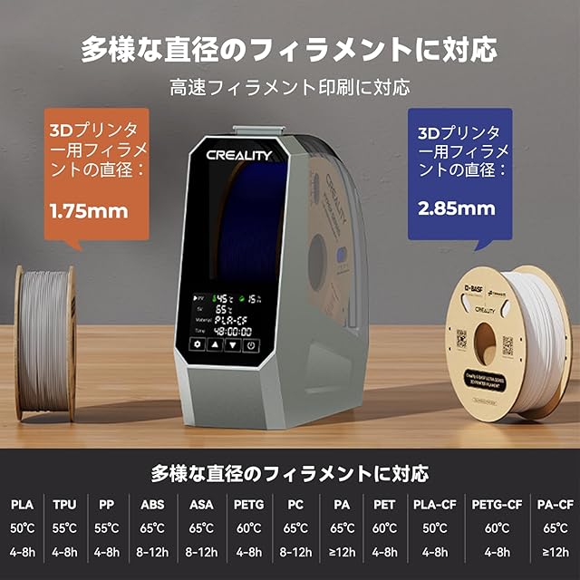 【48時間タイマー機能】0-48時間の間で加熱時間を自由に設定でき、フィラメントを完全に乾燥させ、より良い印刷結果を得ることができます。直径1.75mm/2.85mmの多種のフィラメントに対応します。