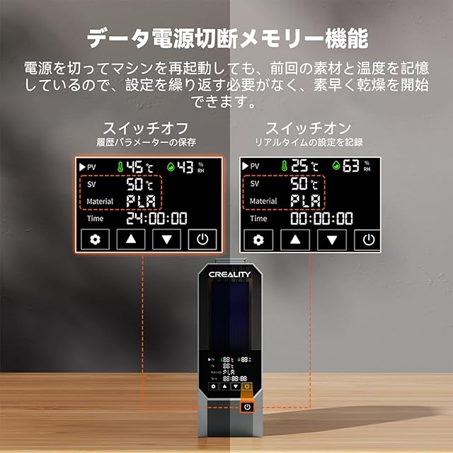 【電源オフ時のメモリー機能】停電後、マシンを再起動すると、前回のフィラメントと温度設定を記憶しているため、リセットの必要がなく、素早く乾燥させることができます。