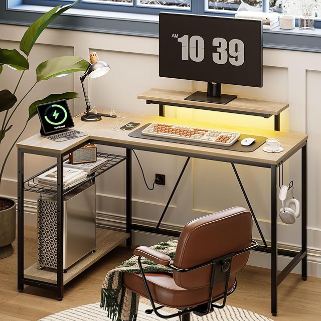 Bestier l字デスク パソコンデスク L字 幅107cm コンセント&モニター台付き ゲーミングデスク LED付き 机 pcデスク ラック付き 左右組み換え可能 棚高さ調節可能 勉強机 L字型 リモートワーク ゲーム 書斎 おしゃれ オーク