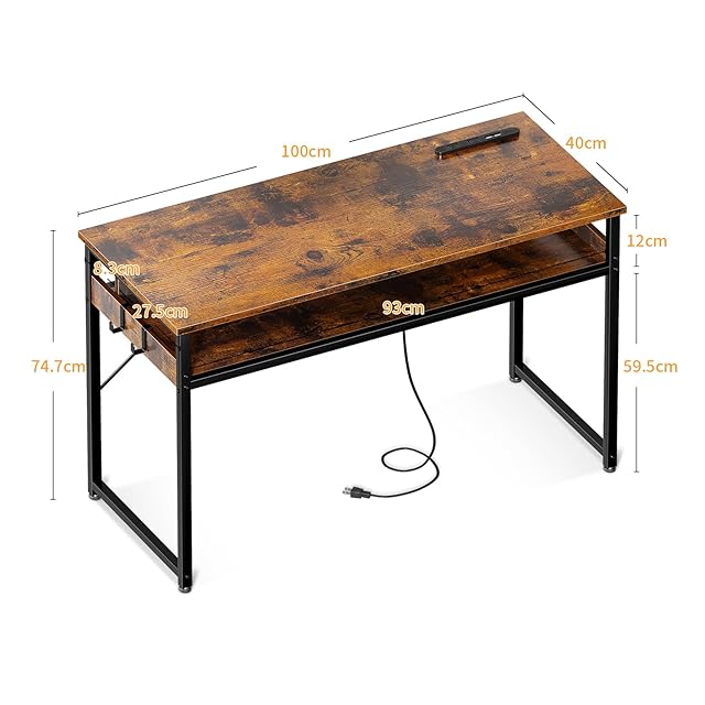 ODK 机 pcデスク パソコンデスク 幅100cm ゲーミングデスク 収納付き コンセント付き 勉強机 computer desk 桌子 ワークデスク 电脑桌 フック2個付き コンパクト テレワーク用 省スペース 組立簡単 ビンテージ