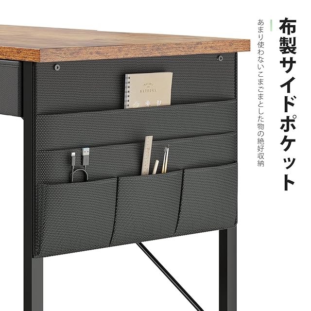 【布製引き出し2個+収納ポケットで整理整頓】厚手布製の引き出しで文房具や小物をすっきり収納。側面のマルチポケットは書籍やノートを分類して収納可能。「引き出し付き デスク」「収納 デスク」として便利です。