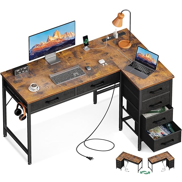 AODK L字デスク パソコンデスク デスク ゲーミングデスク コンセント付き 右棚左棚 PCデスク 引き出し6杯付き 幅106cm 多層収納 頑丈フレーム 省スペース オフィスデスク 学習机 北欧風 家庭用/オフィス用 大容量収納 組立簡単 在宅勤務 ビンテージ