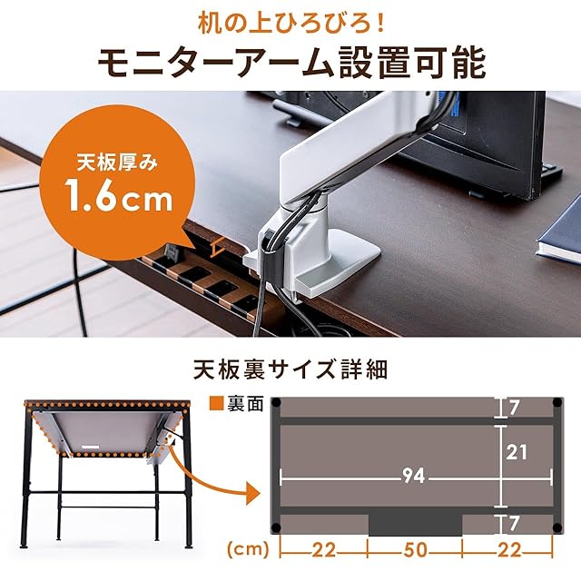 クランプ製品やモニターアームの取り付けに対応した PCデスク です。