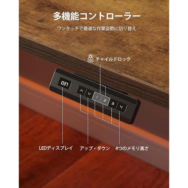 【4つのメモリー機能&チャイルドロック付き手元コントローラー】スタンディングデスクの操作パネルには4つの高さメモリーを登録可能。仕事用・ゲーム用・お子様用など、用途に応じて理想の高さをワンタッチで切り替えられます。さらに、誤操作を防ぐチャイルドロック機能付きで、小さなお子様がいるご家庭でも安心してお使いいただけます。