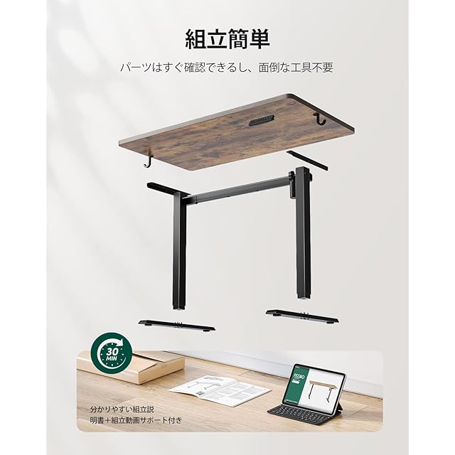 【初心者でも安心の簡単組立&安心サポート】FEZIBO昇降式デスクは分かりやすい日本語説明書に加え、動画マニュアルもご用意。ネジやパーツもわかりやすく整理されており、組立作業は約30分程度で完了します。万が一お困りごとがあった際も、丁寧なカスタマーサポートが迅速に対応いたしますので、安心してお買い求めください。