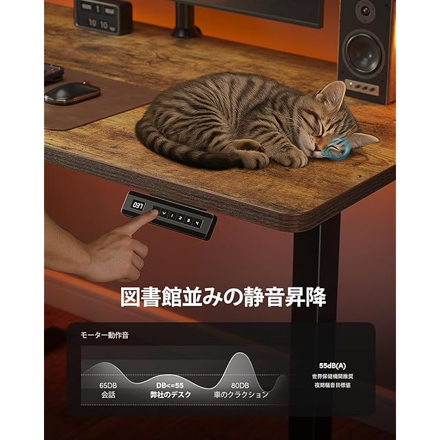 【静音モーター&プロ仕様フレームで安定した昇降】電動昇降デスクは高性能モーターと業務用レベルのフレーム構造により、昇降時の動作はスムーズかつ静音。オフィスや深夜の作業でも音を気にせずご利用いただけます。また、デスクの揺れを最小限に抑える設計で、最上昇位置でも安心して作業に集中できます。