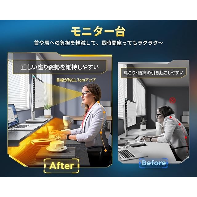 【モニター台付き、卓上の使用面積を広げる】目線が約11.7cm高くなり、背筋が伸びて自然と美しい姿勢に導き、首や肩への負担も軽くなる。モニター台は収納空間も作り出し、卓上の勤務スペースを解放し、デスクが広く使える。作業と収納のエリアを明確に区切り、席に座っているままで欲しいものがサッと手に入れ、作業効率が大幅にアップ。