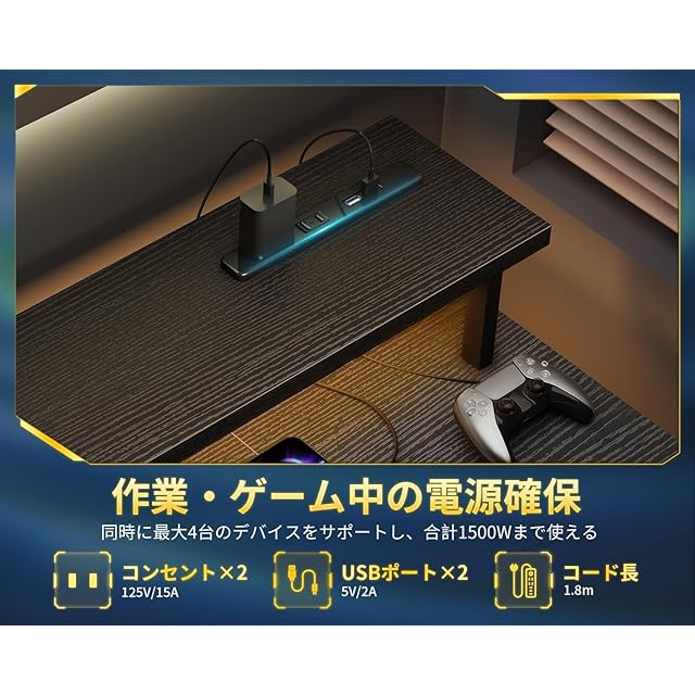 【コンセント付き、作業しながらの電源確保】デスクにはコンセント2口+USBポート2口が付いている。同時に最大4台のデバイスをサポートし、合計1500Wまで使える。手近なところで電源が取れ、スマホやタブレットなどの充電が便利になり、電池残量を気にせずに長時間の作業が可能。